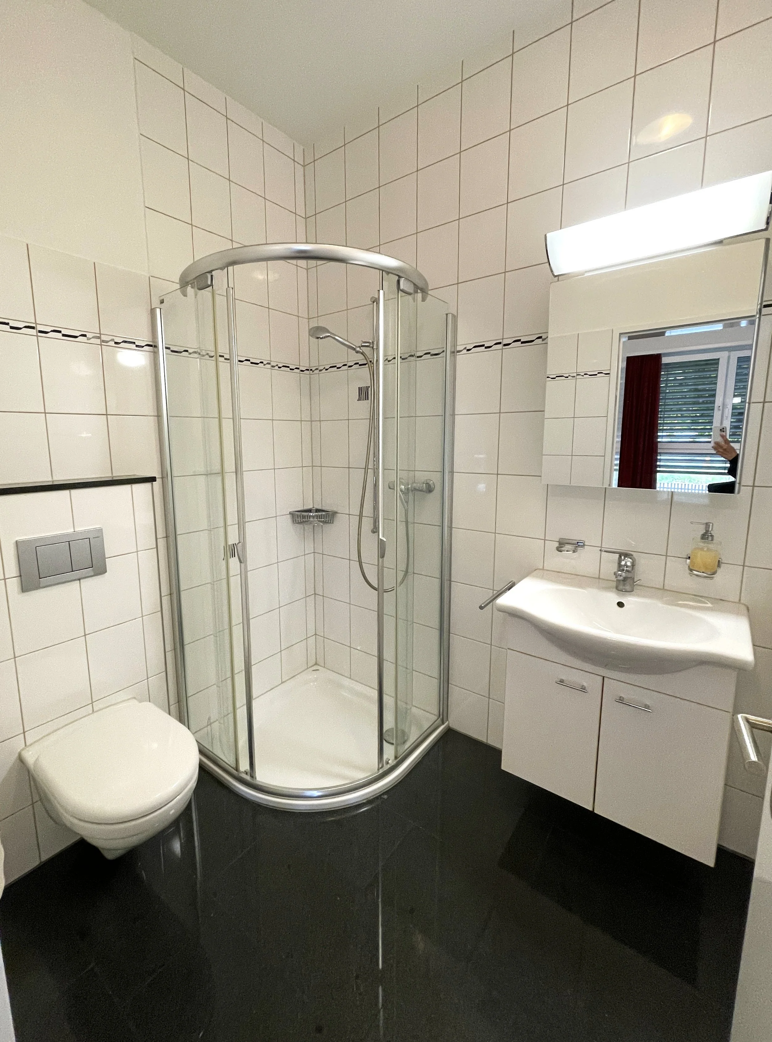 - Schönes Badezimmer mit Eckdusche, Lavabo, Spiegelschrank und WC